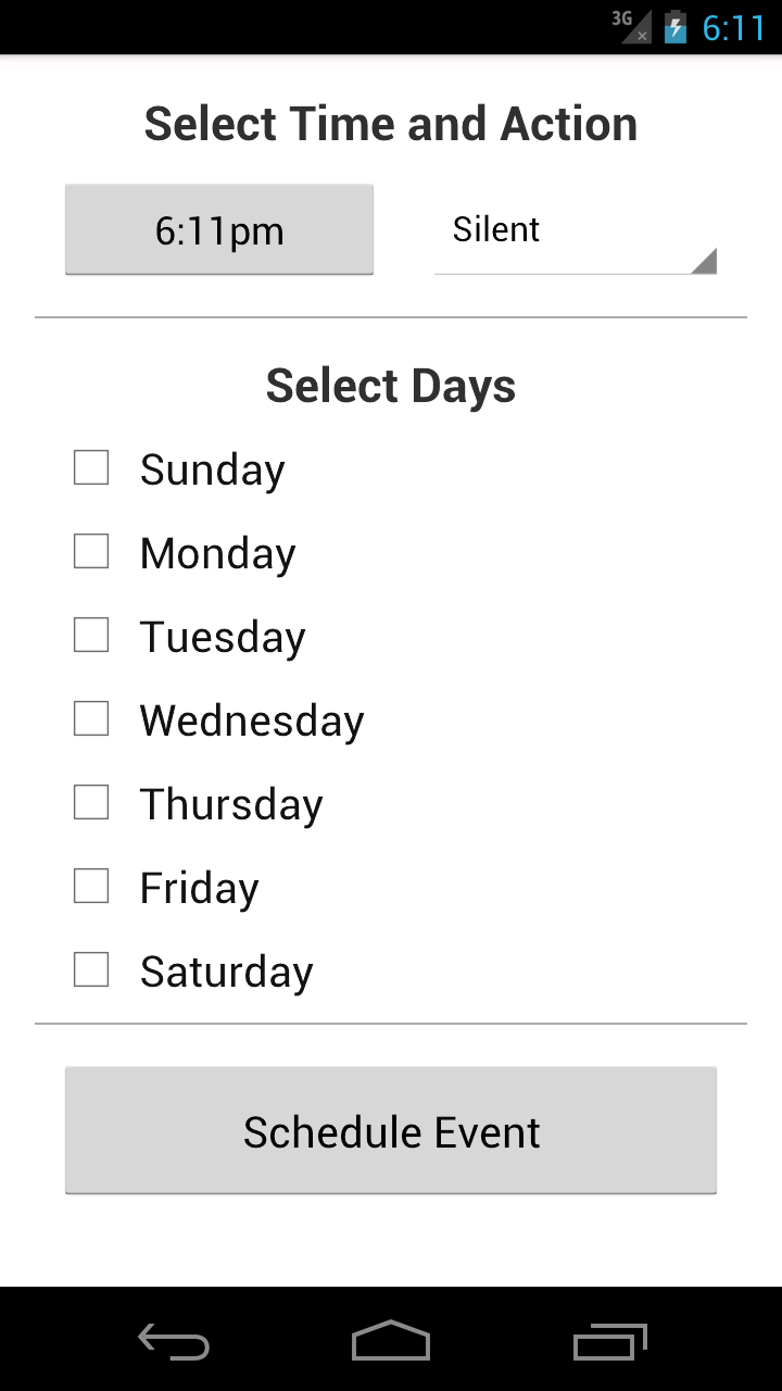 ver 2.2.0 1/27/2015 New User Interface ver 1.10.0 11/29/2013 Spanish Translation added ver 1.9.0 11/27/2013 Added ability to Skip Event the next time it is scheduled ver 1.8.0 11/23/2013 Added display for Event details ver 1.7.0 11/10/2013 Added long click context menu to Enable, Disable, and Remove Events ver 1.6.1 09/20/2013 Corrected issue wiht Custom Ring Volume ver 1.6.0 09/18/2013 French Translation added ver 1.5.0 09/18/2013 Users can set volume (Ringer Custom) when ringer is set ON ver 1.4.4 06/22/2013 Corrected bug that could cause application to crash when enabling event ver 1.4.3 03/31/2013 Corrected enabling Events entered prior to version 1.4.0 would cause crash ver 1.4.1 03/30/2013 Corrected issues with localization of Ring Type Selector ver 1.4.0 03/29/2013 German Translation added ver 1.3.1 02/27/2013 Corrected issue where disabled events were executed after reboot ver 1.3.0 01/26/2013 Events can be schedlued for specific days fo the week ver 1.2.1 12/27/2012 Envets were not being reschedlued after reboot ver 1.2.0 12/27/2012 Broadcast Receiver reads event settings stored in database ver 1.1.2 12/27/2012 Prevent Screen Rotation ver 1.1.1 12/23/2012 Chaned Pause/Play button images for added clarity ver 1.1.0 12/22/2012 Added ability to Enable and Disable events ver 1.0.1 12/20/2012 Corrected issue where Midnight was displaied as 0:00 ver 1.0.0 12/16/2012 Inital release -